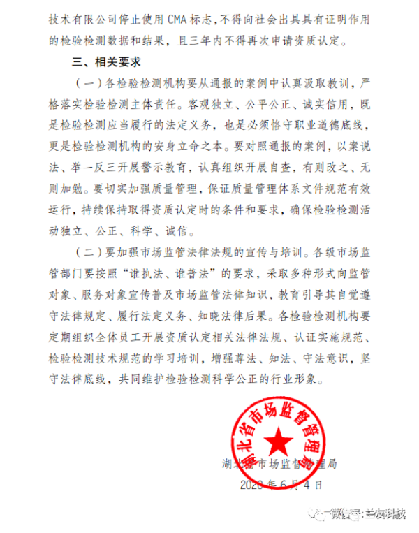 當(dāng)?shù)厥袌?chǎng)監(jiān)督管理局發(fā)布通報(bào):即日起,該檢測(cè)機(jī)構(gòu)停止使用CMA標(biāo)志,不得向社會(huì)出具具有證明作用的檢驗(yàn)檢測(cè)數(shù)據(jù)和結(jié)果,且三年內(nèi)不得再次申請(qǐng)資質(zhì)認(rèn)定。
