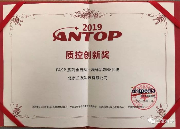 在2019 BCEIA 北京分析學(xué)術(shù)報(bào)告會(huì)暨展覽會(huì)上,北京蘭友科技有限公司推出的FASP系列全自動(dòng)土壤樣品制備系統(tǒng)榮獲“2019 ANTOP 質(zhì)控創(chuàng)新獎(jiǎng)”。